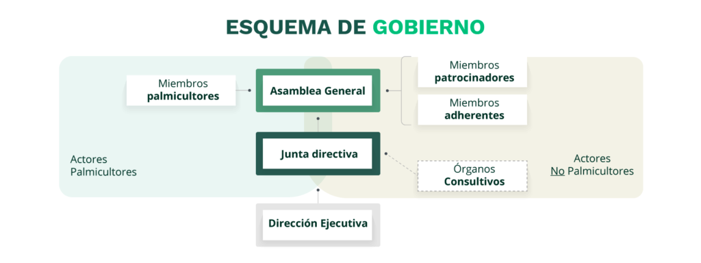 El esquema de gobernanza de la Corporación APSColombia refleja el enfoque multi-actor de esta organización, permitiendo un balance entre la participación de palmicultores y terceros actores interesados, relacionados con la cadena de valor del aceite de palma en Colombia e interesados en la alineación de esfuerzos para promover la adopción de los principios y mejores prácticas de sostenibilidad, así como en hacer visibles los esfuerzos de pequeños, medianos y grandes palmicultores, y facilitar su acceso a los mercados.